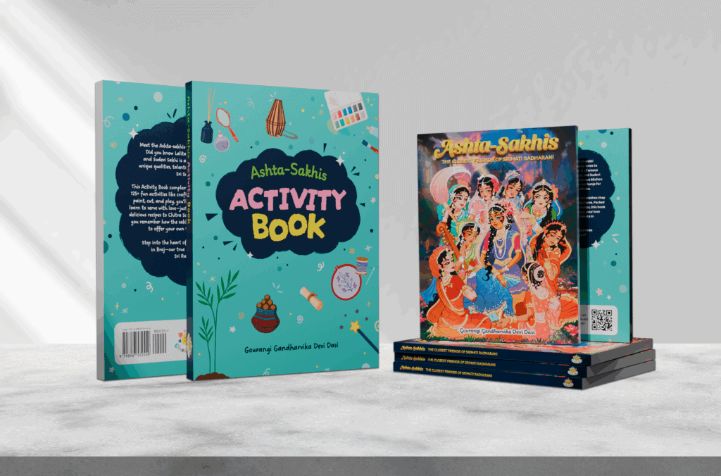 The Ashta-Sakhis learning book also comes with an Activity Book which features 125+ fun activities like crafts, puzzles, games, music, and more! As you paint, cut, and play, you’ll connect personally with the sakhis and learn to serve with love—just like they do. From Champakalata Sakhi’s delicious recipes to Chitra Sakhi’s painting skills, each activity will help you remember how the sakhis serve Radha-Madhava and inspire you to offer your own talents in Krsna’s loving service.